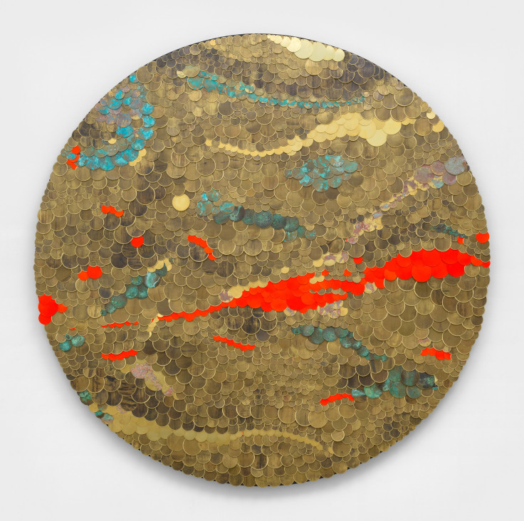 In the wall-based work Scars, 2025, the artist skillfully manipulates oxidation and patina to push his palette into new directions, introducing rich tones of turquoise and umber punctuated by day-glo safety orange. Although stationary, the pounded brass artillery shells seem to ripple across their surfaces, recalling both dragon scales and armor. Occupying a central place in Vietnamese mythology, the dragon is the symbol of yang, representing the universe, life, and growth. It is also symbolic of the aquatic world, a guardian and protector capable of bringing the rain essential for agriculture, as well as harnessing clouds, thunder and lightning, and drought and flooding. During the Vietnam War, the U.S. deployed a chemical cloud-seeding project that aimed to extend the monsoon season on specific sections of the Ho Chi Minh Trail. Drawing from this mythological and military history, Nguyen transforms artillery shells from this conflict, meant to cause irreparable harm, into emblematic monuments to survival.
